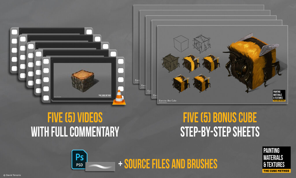 The Main Course + Bonuses will contain the five (5) video tutorials PLUS five (5) additional step-by-step sheets showing new and advanced cubes to practice. This set will also include .PSD source files and an exclusive brush set used in the creation of the tutorial (Photoshop and Procreate Compatible.)