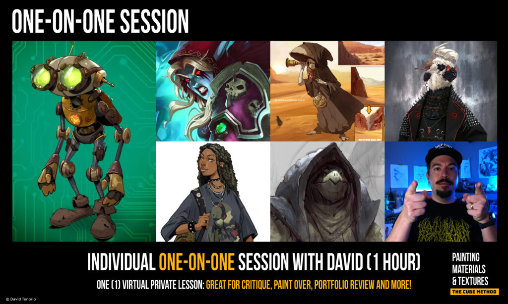 In addition to the tutorial packages, there will be a limited number of registrations available that include a One-On-One private lesson with David! This virtual 1 hour session is great for critiques, paint overs, demos and/or a portfolio review! This is your chance to meet with an industry artist that will help take your work to the next level (this registration includes all advertised materials including tutorial videos and bonus files.)